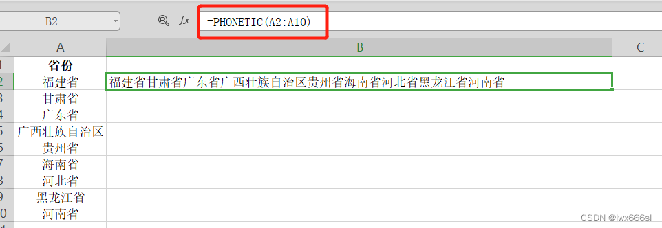 =PHONETIC(A2:A10),该公式可以拉取区域内所有单元格,实现合并,如果需要在每个省份后面加个分号,则同样需提前在A列文本后先加分号,再使用公式