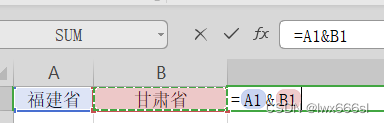 如A1="福建省",B1="甘肃省",合并公式=A1&B1,即可得到