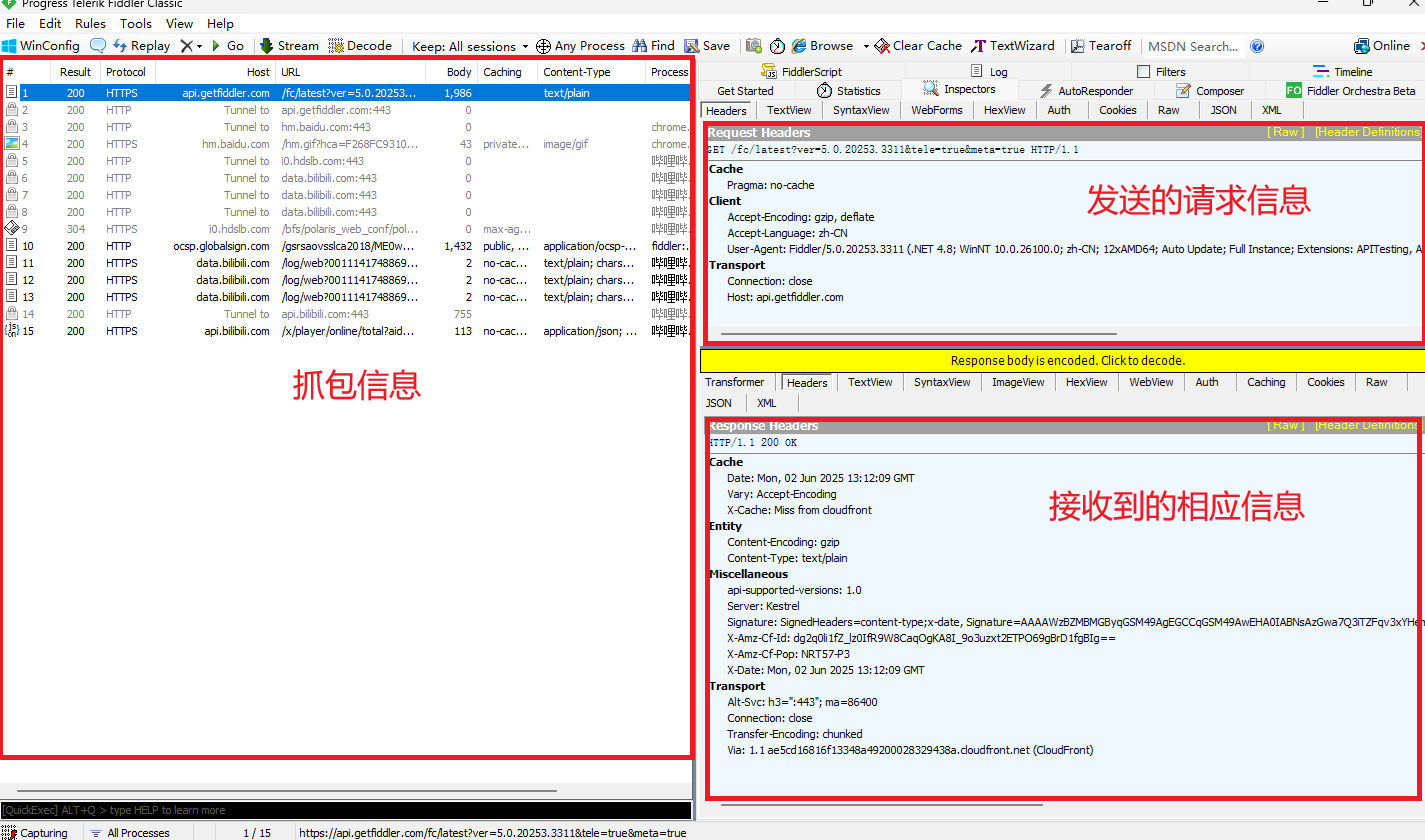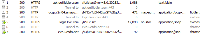 刚打开时左侧可能一下子蹦出来很多的信息,这是因为你后台的应用实际上并不安分,一直在和服务器之间进行沟通,而我们的抓包工具都给这些信息全部抓获了。