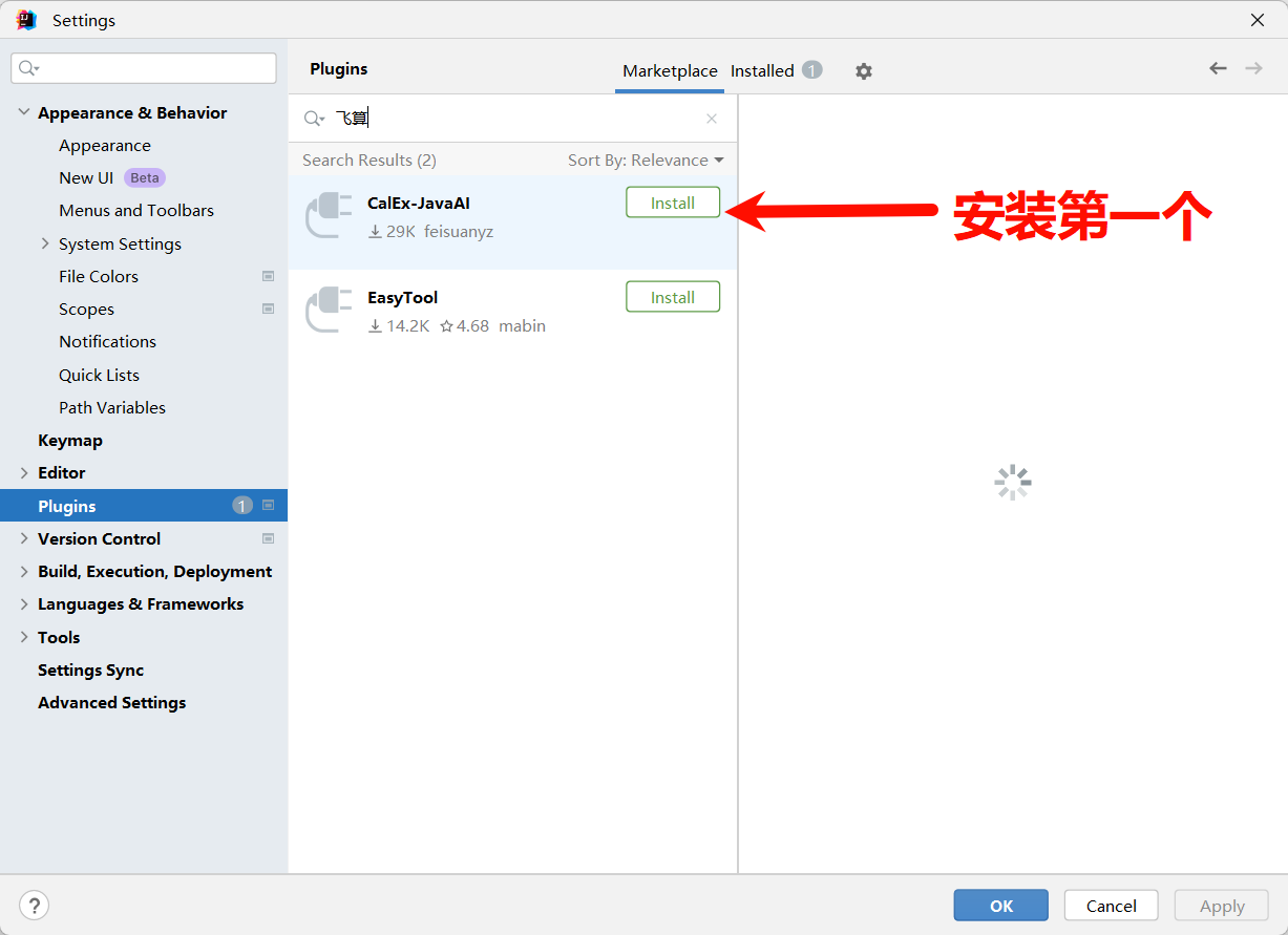 2.打开IDEA,找到插件市场搜索"飞算"或者"CalEx-JavaAI"点击安装