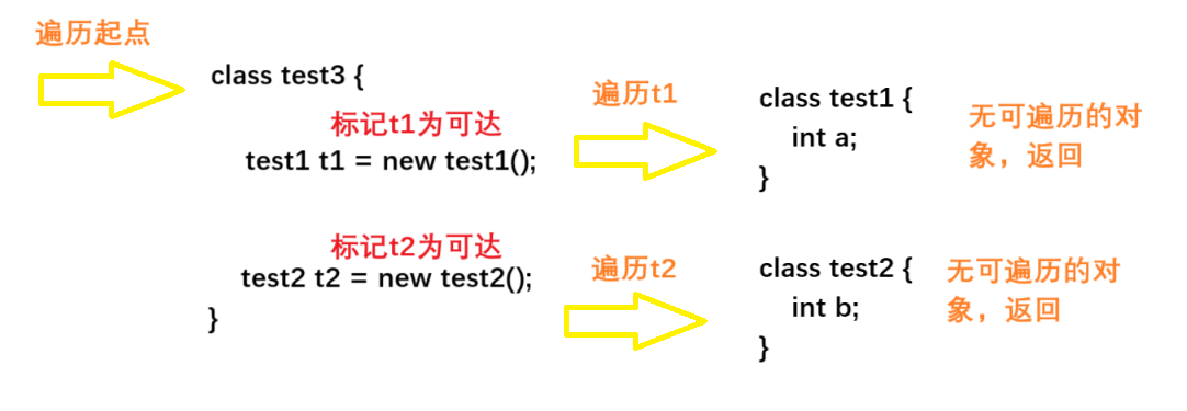 test3 t3 = new test3();可达性分析在开始的时候从t3开始遍历,因为t3存在t1和t2这两个已经开辟空间的对象,GC会将t1和t2都标记为“可达”,并且遍历t1和t2,但是因为t1和t2的属性中并没有可以遍历的对象,因此不会继续遍历,而如果t1和t2内部的属性中也是存在开辟空间了的对象,同样也会遍历和标记为“可达”。
