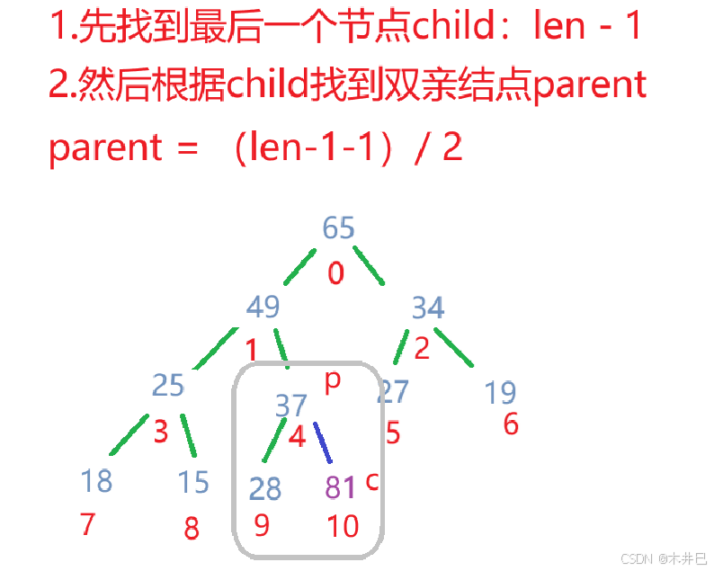 这种存储方式既节省空间,又能快速定位任意节点的父节点和子节点。