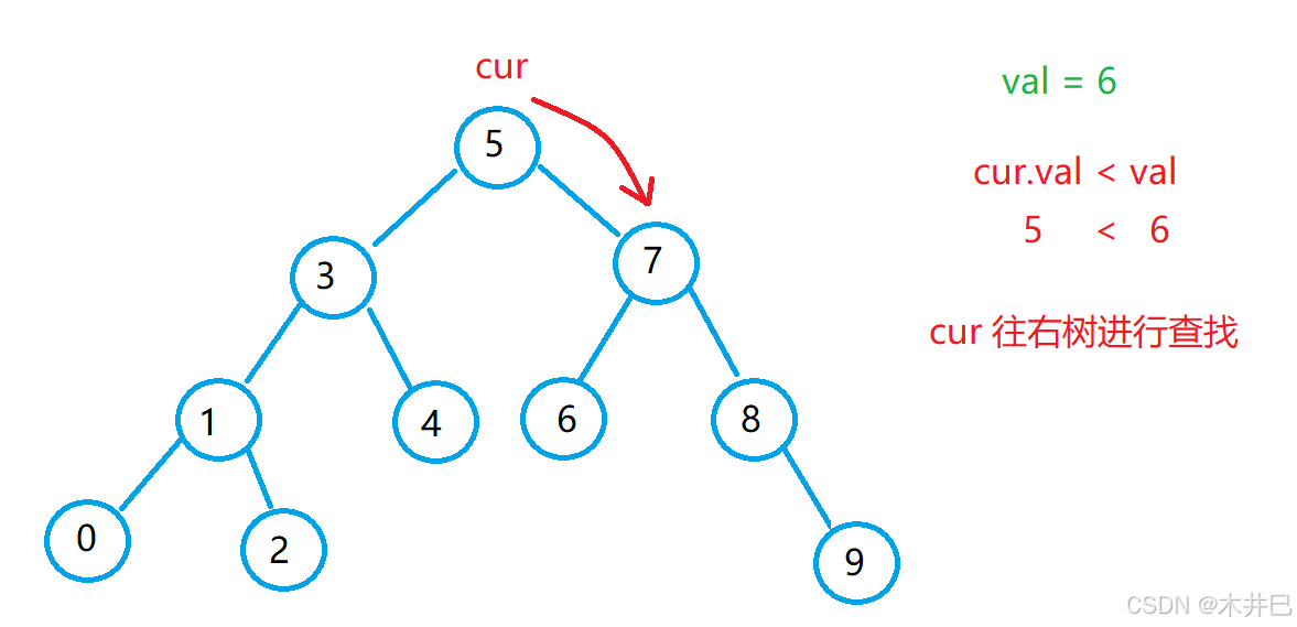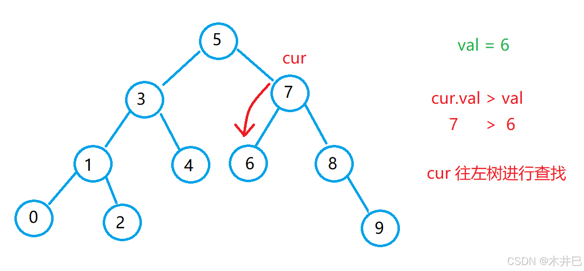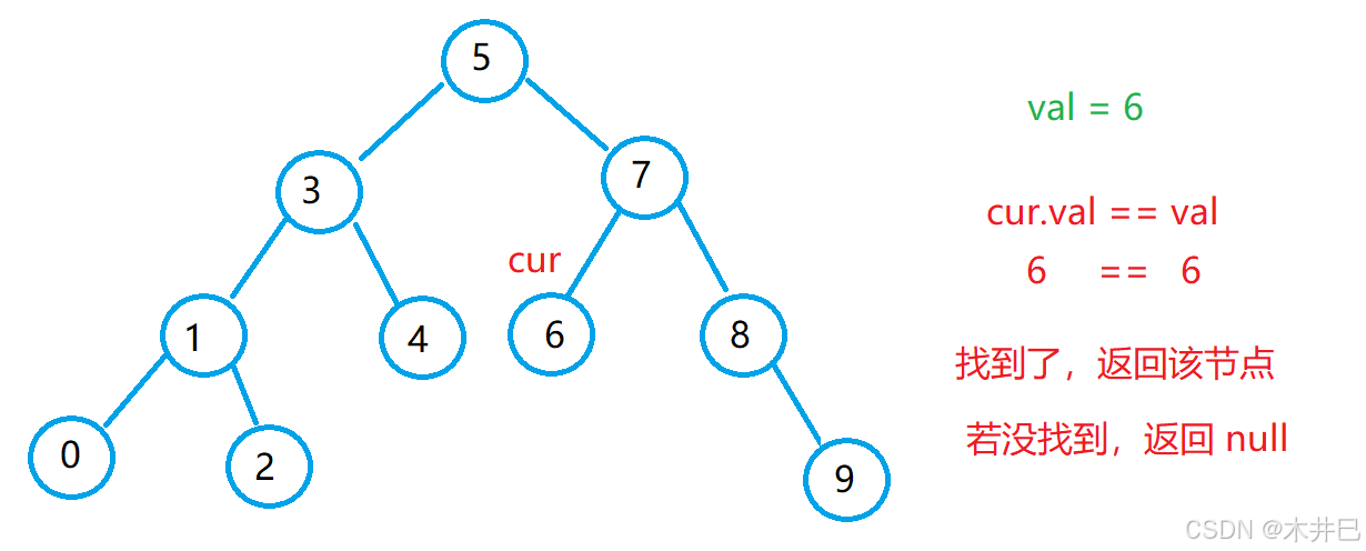 }遍历二叉树,遍历每一个结点(cur)的时候,与所要查找数据(val)进行比较: