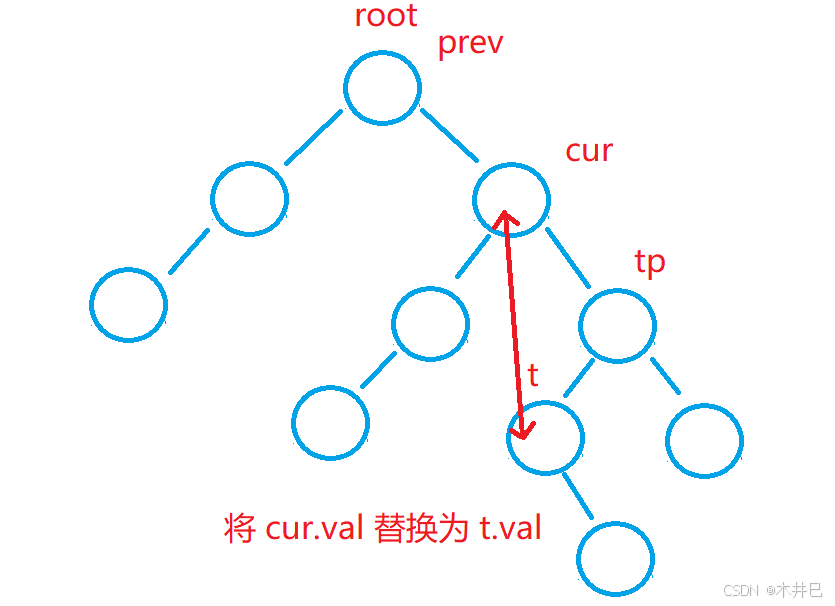 从 cur 的左树找最右边的结点 / 右树找最左边的结点 (我们称之为 target,其上一个节点为 targetPrev)来替换 cur.val