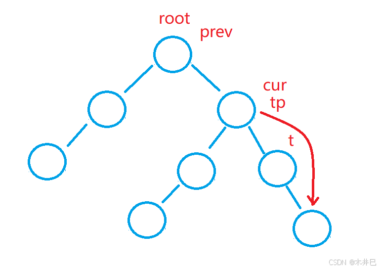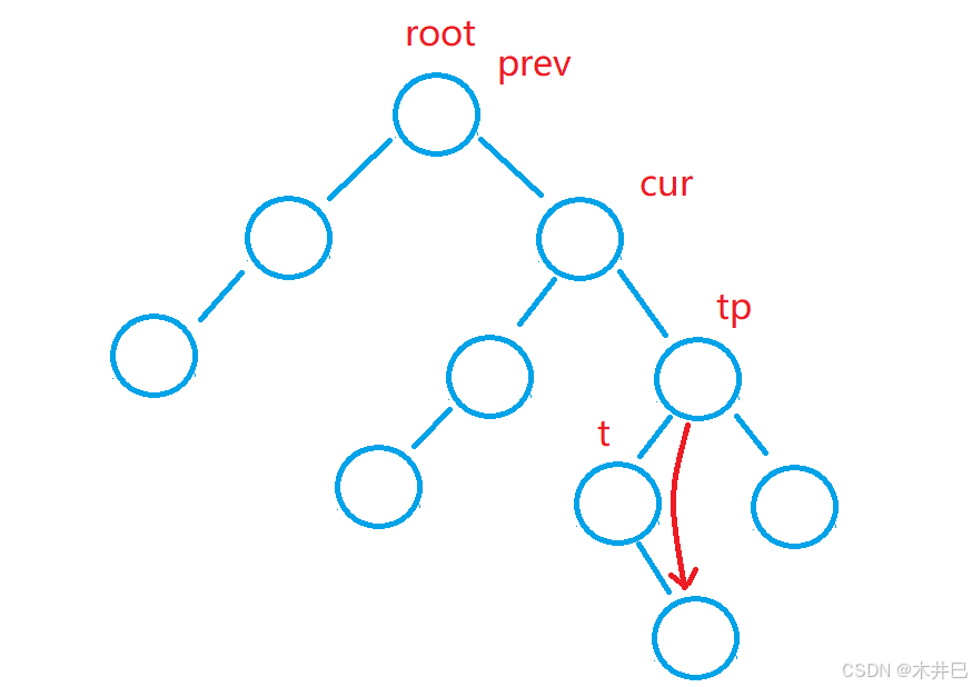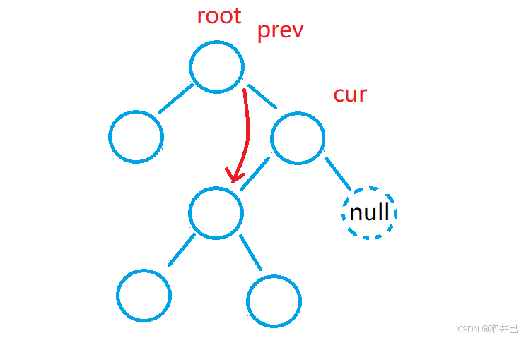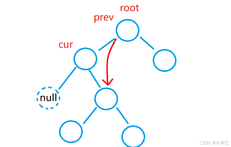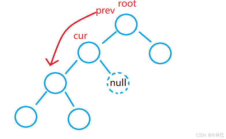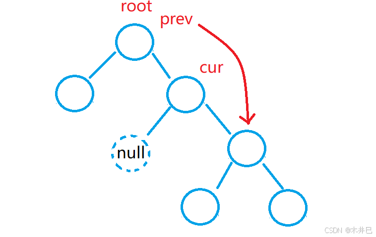 2. cur 的右树为空且左树不为空时,我们同样需要判断 cur 是树根节点还是 prev 的左/右子树: