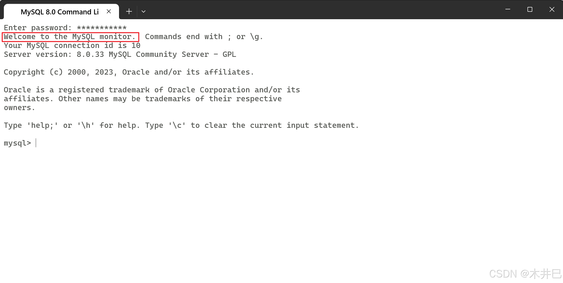当我们启动mysqld程序(客户端程序)、输入设定的密码之后,就成功连接到mysql服务器了:
