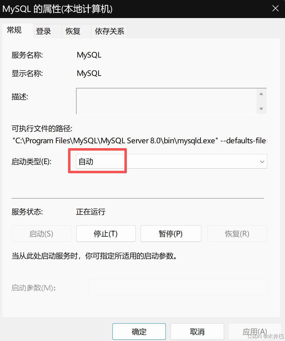 初次安装MySQL服务配置默认是自动的,当操作系统运行就会自动运行mysqld程序,从而启动mysql服务。