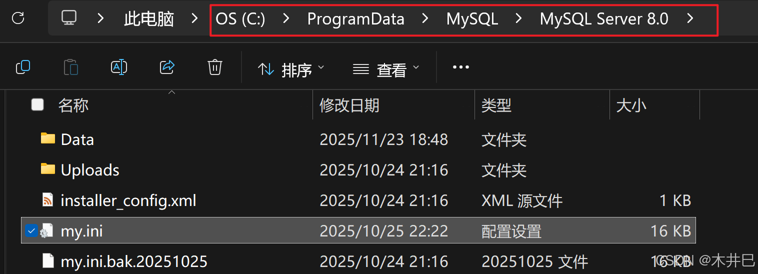 选项文件的默认路径在 C: \ProgramData \MySQL \MySQL Server 8.0 \my.ini