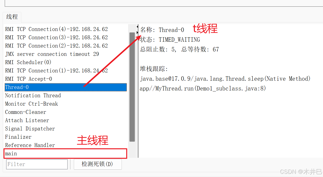 这里看到t线程被自动命名为 “Thread-0” 了,实际上Thread类是可以自定义线程名称的,以便程序员辨认自己写的线程。当程序员没有提供自定义的线程名称时,JVM就会自动给线程按照顺序命名。