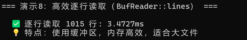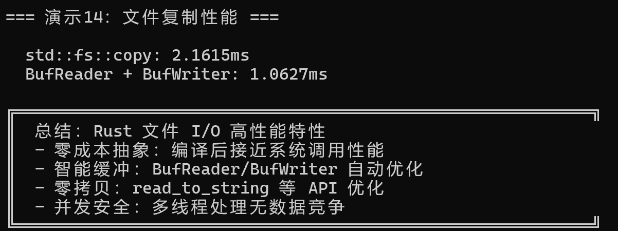 本项目通过14 个实际演示,全面展示 Rust 文件 I/O 的高性能特性: