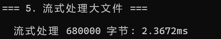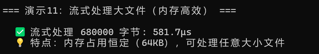 流式处理 | 支持大文件流式读写 | 内存占用恒定 |