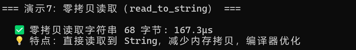零拷贝 | read_to_string 等 API 优化 | 减少内存拷贝 |