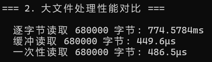 智能缓冲 | BufReader/BufWriter 自动优化 | 减少系统调用次数 |