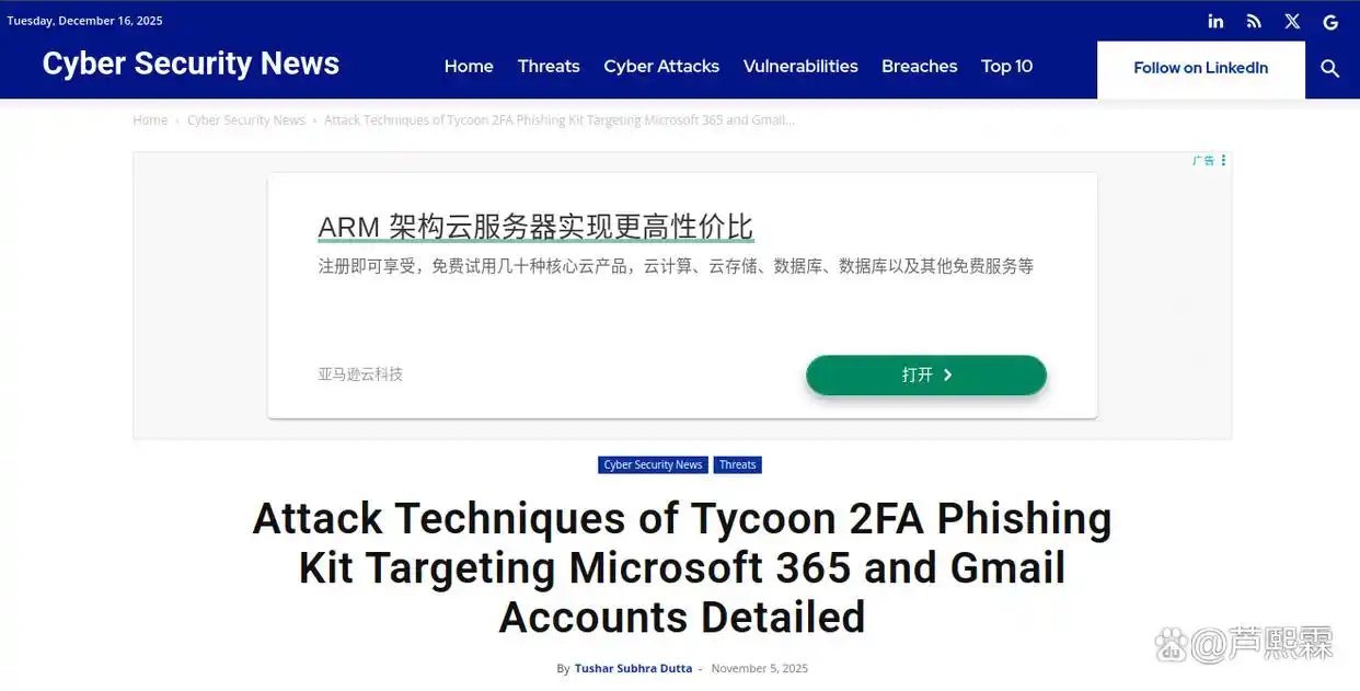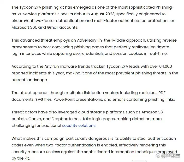 关键词:Tycoon 2FA;AitM 攻击;钓鱼即服务;MFA 绕过;会话劫持;反向代理;Microsoft 365;Gmail