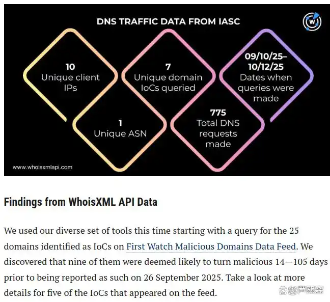 通过对 25 个 IoC 域名的 DNS 历史记录分析(基于 WhoisXML API 的 DNS Chronicle 数据),发现攻击者采用多层次隐蔽策略。