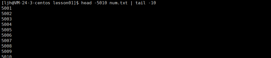 先从 num.txt 中取出前 5010 行,再从这 5010 行里取出最后 10 行(也就是原文件中 “第 5001 行到第 5010 行” 的内容)