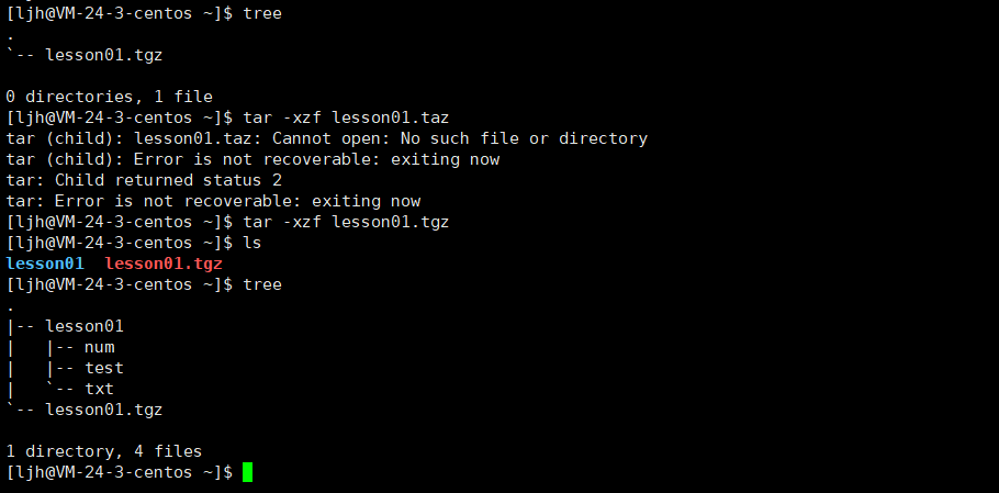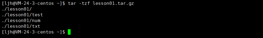 tar -tzf 压缩包名.tar.gz示例:查看 lesson01.tar.gz 里的文件