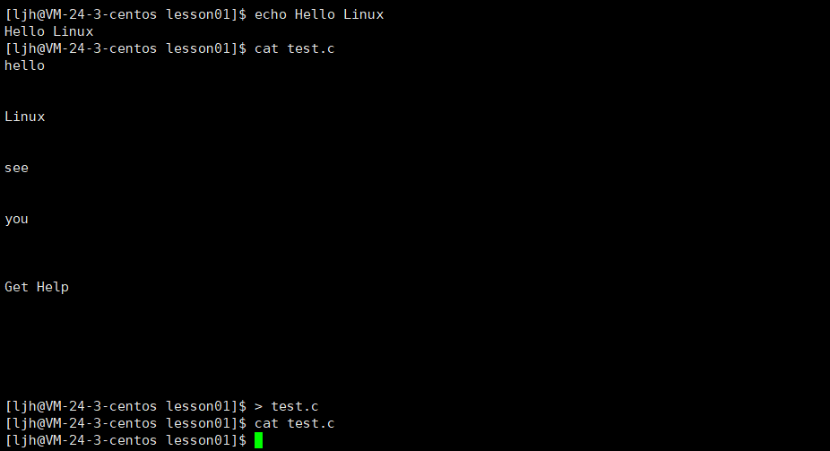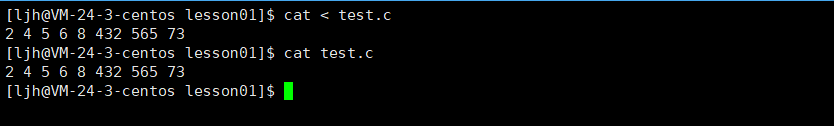 虽然下面指令的输出结果一样,但是实际上第一个是把文件的内容重定向到 cat 命令的输入,让 cat 读取该文件内容并输出;第二个则是 cat 命令直接读取指定文件 test.c 的内容并输出。二者最终呈现的结果相同,但操作的逻辑和底层的输入源指定方式有细微差别,不过在实际使用中,这两种方式都能达到查看 test.c 文件内容的目的。