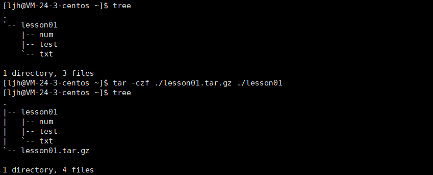 tar -czf 压缩包名.tar.gz 要压缩的文件/目录示例:把 lesson01 目录打包压缩成 lesson01.tar.gz