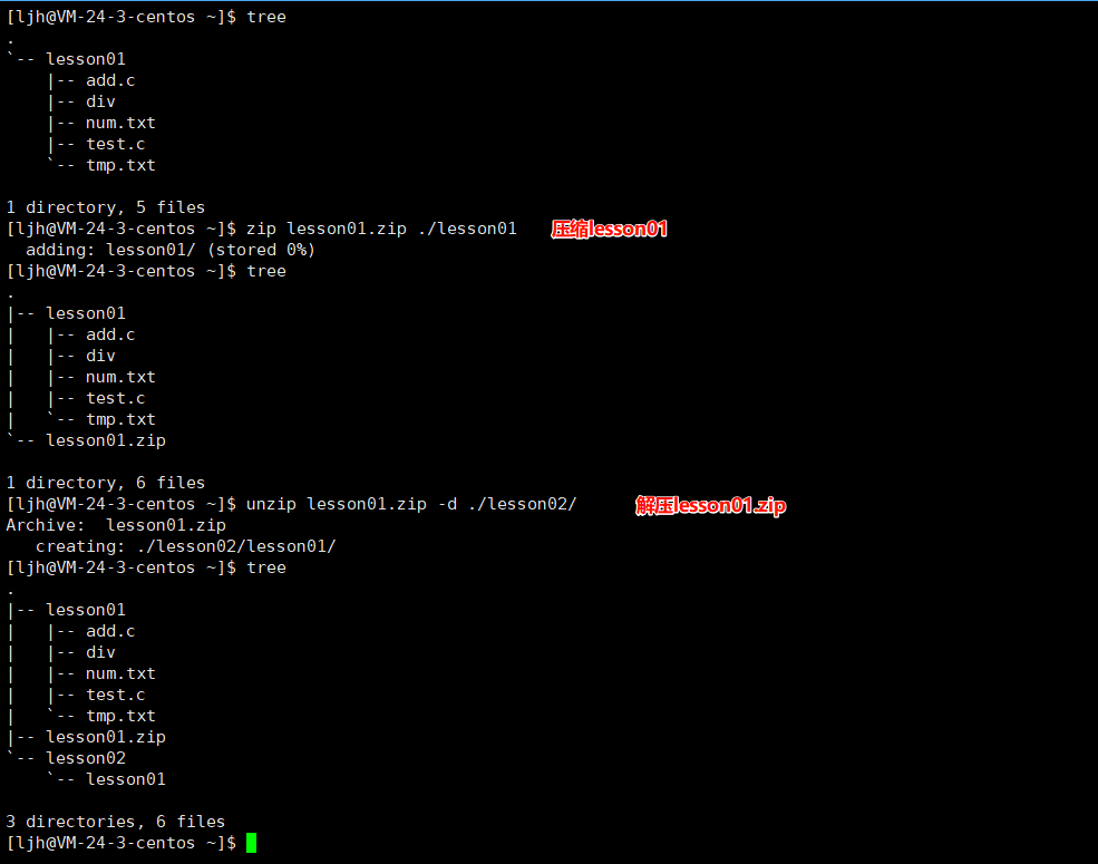解释:我先把lesson01压缩到当前目录,最后再解压到当前目录的lesson02目录中,发现lesson01完全一致