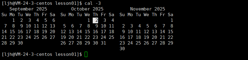 -3:显示系统前一个月、当前月、下一个月的月历,能直观查看连续三个月的日期情况。-j:显示日期在当年中的第几天(一年日期按天算,从 1 月 1 日起算),默认显示当前月各日期在当年的天数。-y:显示当前年份的完整日历,可查看一整年的日期分布。【举例】