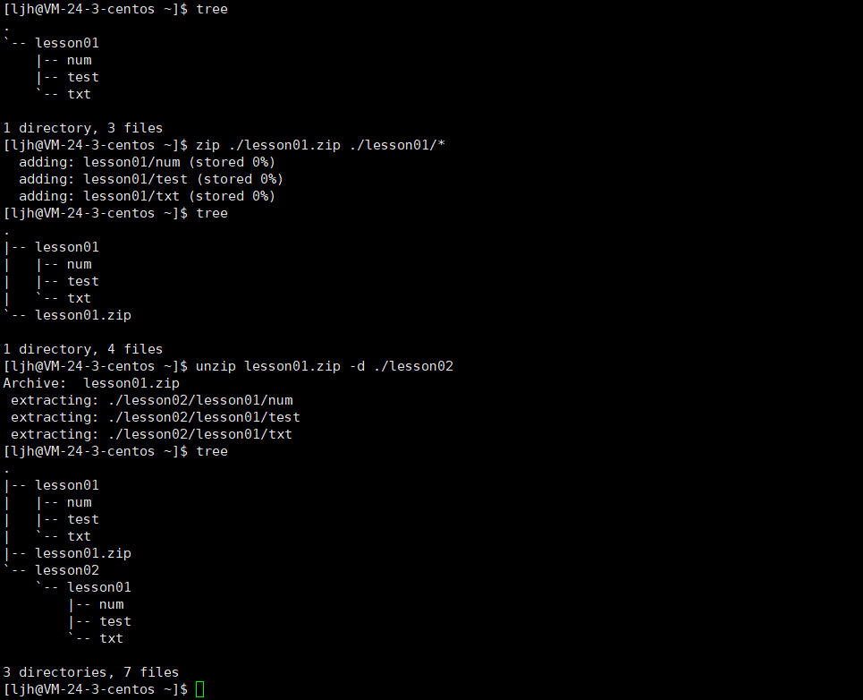 解释:当前目录下只有一个lesson01,我把lesson01压缩到当前目录,删除了之前的lesson01,解压lesson01.zip,发现lesson01目录下的所有文件都在,这表明了,整个目录的文件都被压缩并且解压