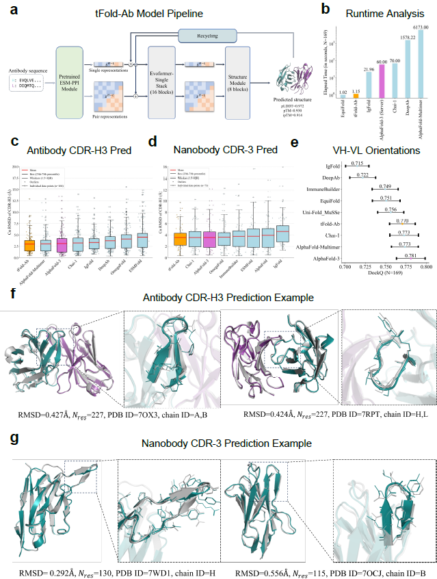 tFold-Ab 由预训练蛋白语言模型(ESM-PPI)、Evoformer-Single、结构模块和循环模块组成,可在数秒内预测抗体的原子级三维结构。