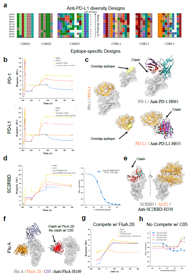 研究人员针对 Flu A、PD-1、PD-L1 和 SARS-CoV-2 RBD 生成并筛选大量抗体候选。实验结果显示: