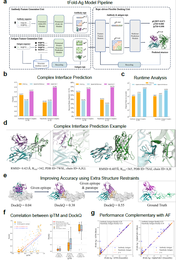 tFold-Ag 由抗体特征单元、抗原特征单元和柔性对接单元组成,可预测复合物结构并提供可用于筛选的置信度分数。