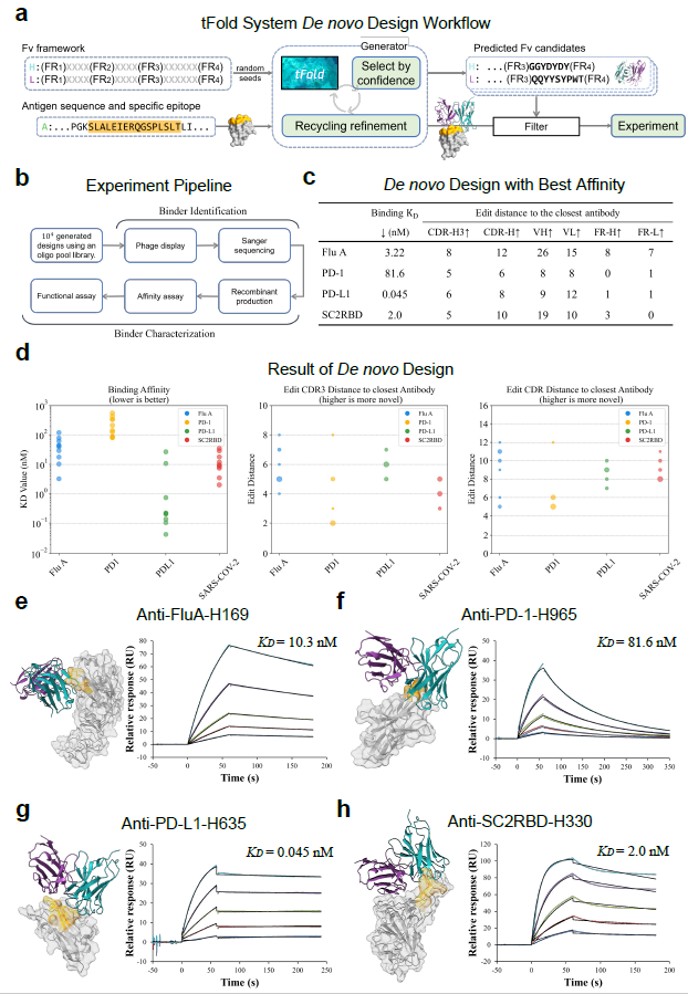 精准预测抗体–抗原复合物结构对于抗体治疗开发至关重要,但传统抗体发现仍依赖动物免疫或库筛选,效率低且难以针对特定表位。研究人员构建 tFold System,整合抗体结构预测(tFold-Ab)、抗体–抗原复合物预测(tFold-Ag)、结构引导的虚拟筛选,以及表位特异性抗体的 de novo 设计。借助该系统,研究人员成功设计出针对 4 种治疗相关抗原(Flu A、PD-1、PD-L1、SARS-CoV-2 RBD)的单克隆抗体,并通过表面等离子共振实验验证,其亲和力达到纳摩尔至皮摩尔水平,且具有精确的表位特异性。tFold System 为快速、高通量、面向特定表位的抗体发现提供了计算–实验一体化解决方案。