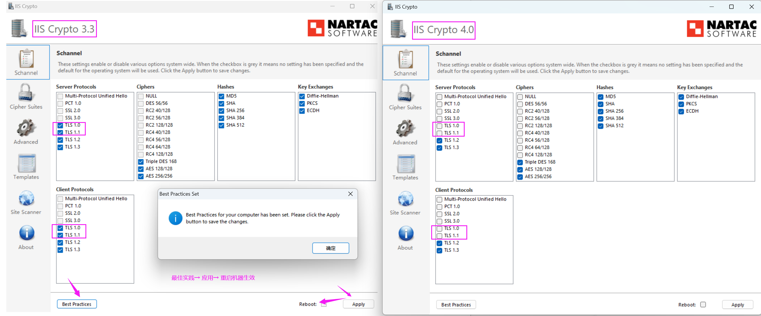 对比了IISCrypto.exe版本,发现IISCrypto.exe V2、V3.2、V3.3最佳实践按钮包括了tls1.0、tls1.1,V4版本则去掉了,一般用V3.3版本应用最佳实践按钮即可