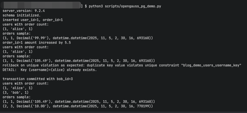 本文基于本地环境进行一次面向应用开发者的轻量测评,关注“易用性、兼容性、事务语义、开发体验”。示例通过 PostgreSQL 驱动(psycopg2)连接 openGauss,并在数据库中进行若干简单的表操作与事务演示。