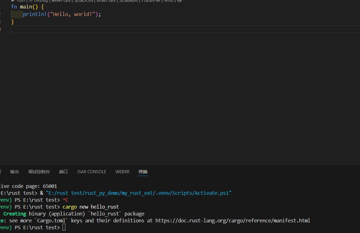 └─ Cargo.toml # 项目配置文件(类似说明书)打开 src/main.rs,会看到 Rust 自动生成的 Hello World 代码: