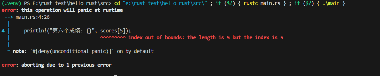println!("第六个成绩:{}", scores[5]); // 错误:索引 5 不存在(最大是 4)
