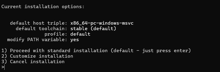 3) Cancel installation直接按 Enter 选默认安装(1),等待 1-3 分钟(会自动下载 Rust 编译器和工具链)。