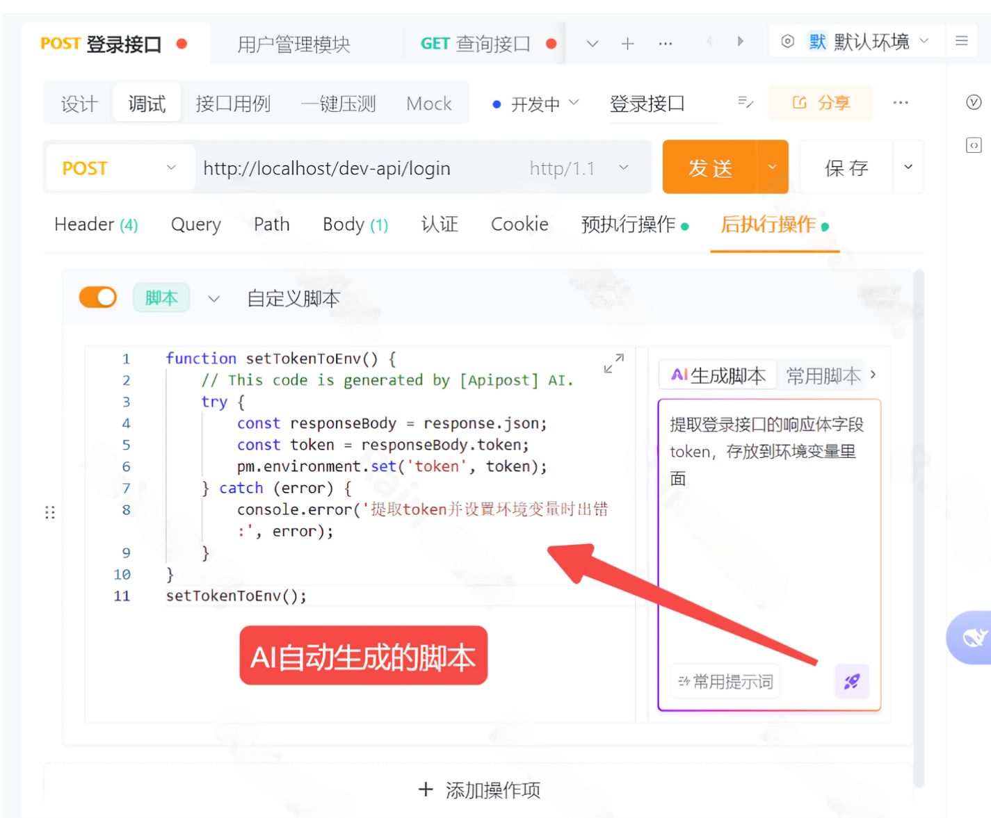 apipost里面已经内置AI生成脚本的功能,所以也很方便;