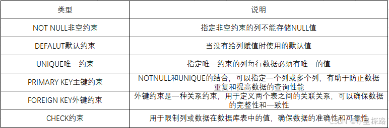 数据库约束是指对数据库表中的数据所施加的规则或条件,用于确保数据的准确性和可靠性。这些约束可以是基于数据类型、值范围、唯⼀性、非空等规则,以确保数据的正确性和相容性。