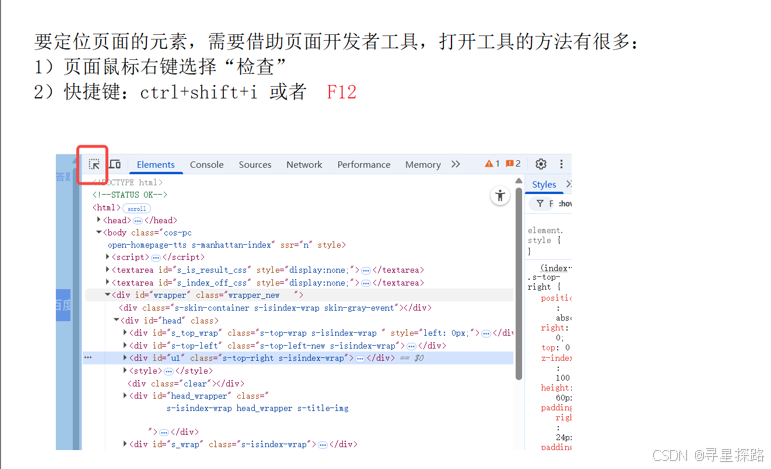 定位百度首页的“百度热搜”元素,可以使用通过id选择器和子类选择器进行定位:#s-hotsearch- wrapper >div