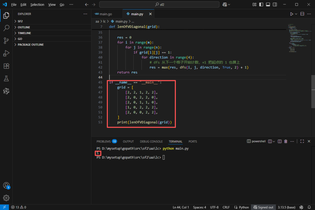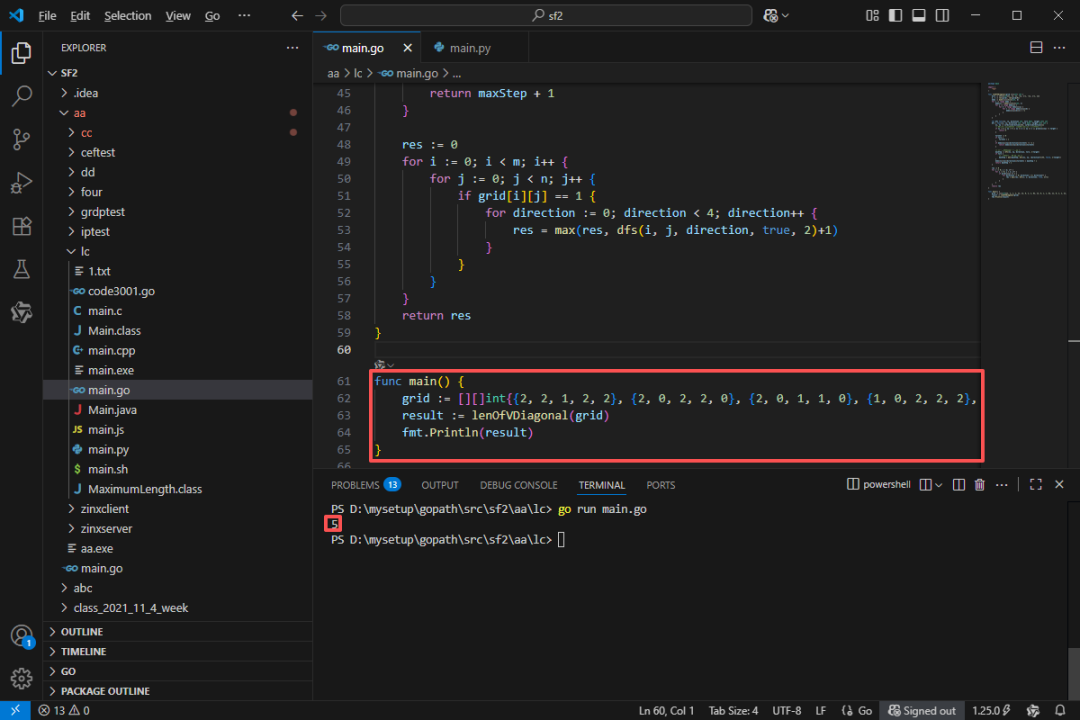 func lenOfVDiagonal(grid [][]int)int {