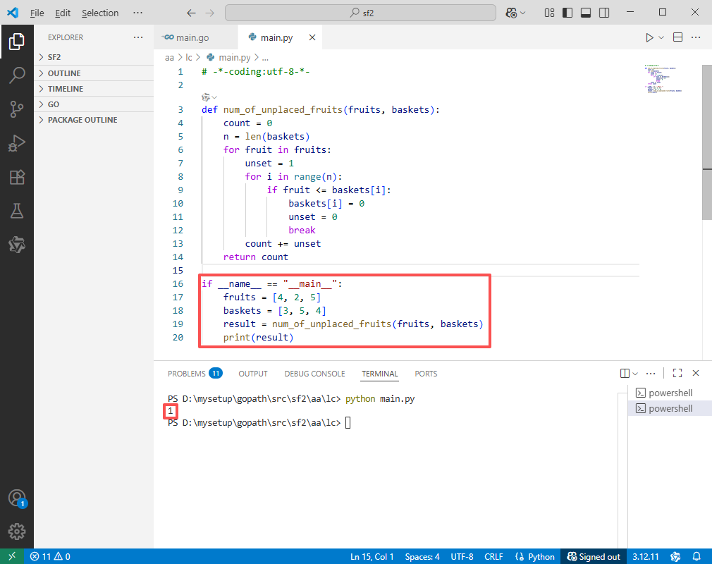 fruits,其中每个元素 fruits[i] 表示第 i 类水果的数量。baskets,其中每个元素 baskets[j] 表示第 j 个篮子的容量上限。fruits[0] 到 fruits[n-1])逐一处理每一类水果。fruit(即 fruits[i]),我们需要找到一个篮子来放置它。baskets[0] 到 baskets[n-1])扫描篮子数组,寻找第一个尚未被占用(即篮子容量值未被置零)且容量至少等于当前水果数量(即 baskets[j] >= fruit)的篮子。unset 为0),并继续处理下一个水果。count 增加1(因为 unset 保持为1)。count,即未被放入任何篮子的水果种类数量。count、unset和循环变量),没有使用与输入规模相关的额外数据结构。因此,总的额外空间复杂度为 O(1)。注意:虽然我们修改了原始的baskets数组(原地标记占用),但题目允许修改(根据代码逻辑),且这并不算额外空间(因为输入数组本身可被修改)。所以额外空间复杂度是常数。