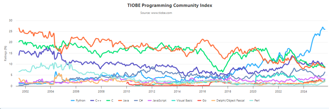TIOBE 编程社区指数是衡量编程语言流行度的指标。该指数每月更新一次。评分基于全球熟练工程师的数量、课程和第三方供应商。用于计算评分的站点包括 Google、Amazon、Wikipedia、Bing 以及 20 多个其他网站。需要注意的是,TIOBE 指数并不是关于哪个编程语言最好,也不是关于哪种语言写的代码行数最多。