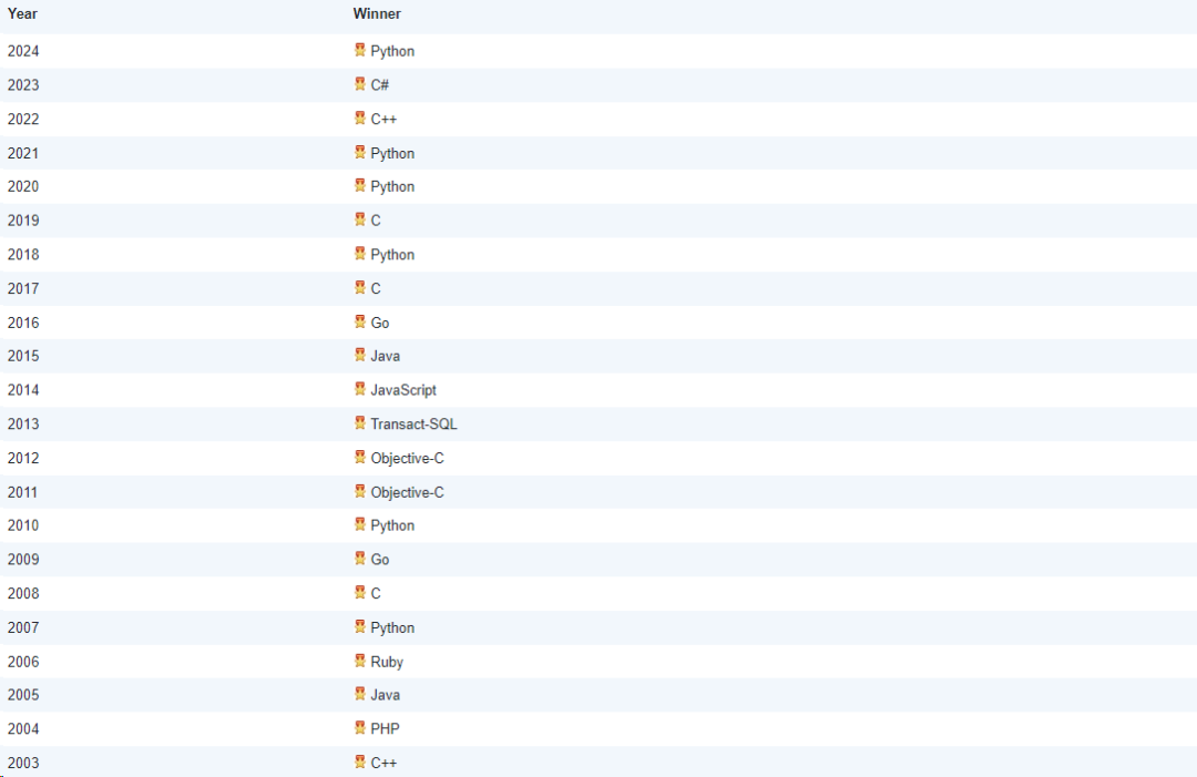 下面列出了所有“年度编程语言(Programming Language of the Year)”获奖者的名人堂。该奖项授予在一年内评分升幅最大的编程语言。