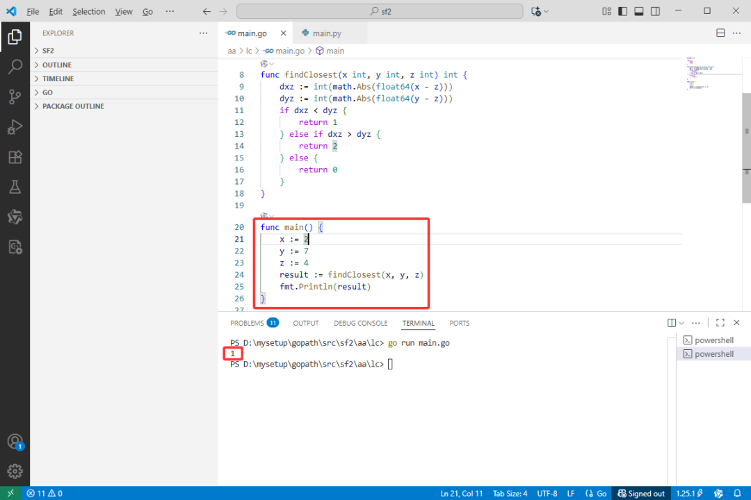 因为速度相同,谁先到达取决于与 z 的距离:若 |x−z| 小于 |y−z| 返回 1;若 |y−z| 小于 |x−z| 返回 2;若两者相等则返回 0。