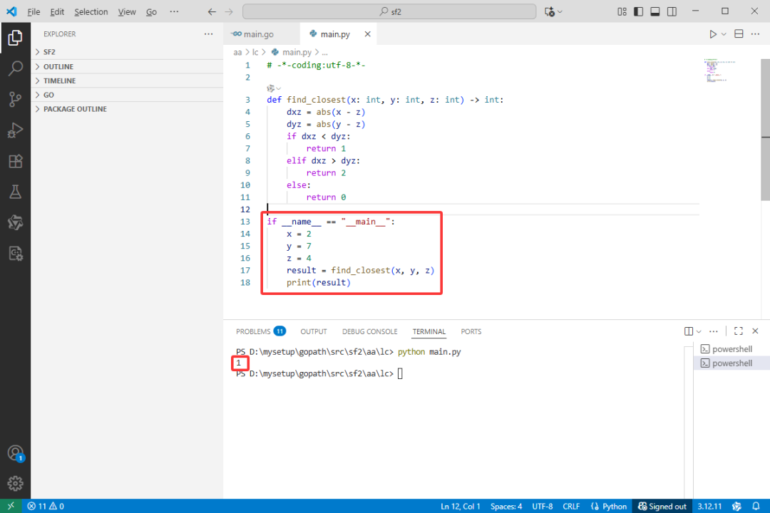 2025-10-05:找到最近的人。用go语言,有三个整数 x、y、z,表示数轴上三个人的位置。
