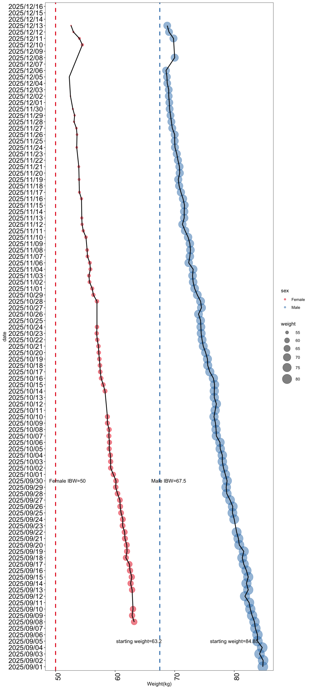 annotate(geom = 'text', label="Male IBW=67.5", x=30, y=69)+