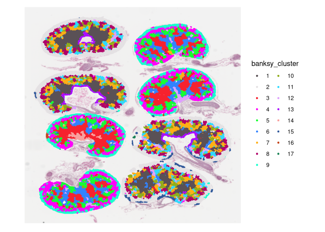 hd_obj_filtered <- FindClusters(hd_obj_filtered, cluster.name = "banksy_cluster", resolution = 0.5)# Arrange so clusters get listed in numerical order
