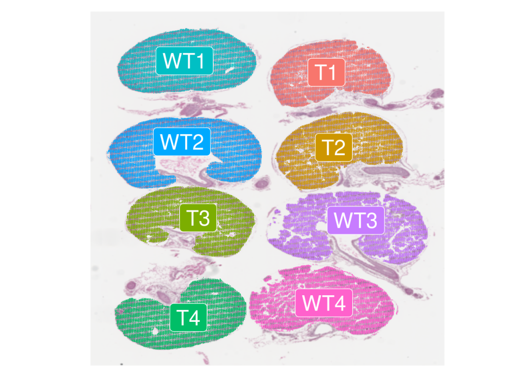 这个结果,虽然我们把这8个sample当一张片子做的,但是它还是区分出了WT和T组的区别。两组之间的cluster明显是区别的,很有意思。同时作为kidney,虽然组之间不同,但是空间结构倒是大差不差的区别出来了。RunBanksy聚类与seurat聚类不冲突,实际上是互补的结果,取决于您的研究目的。