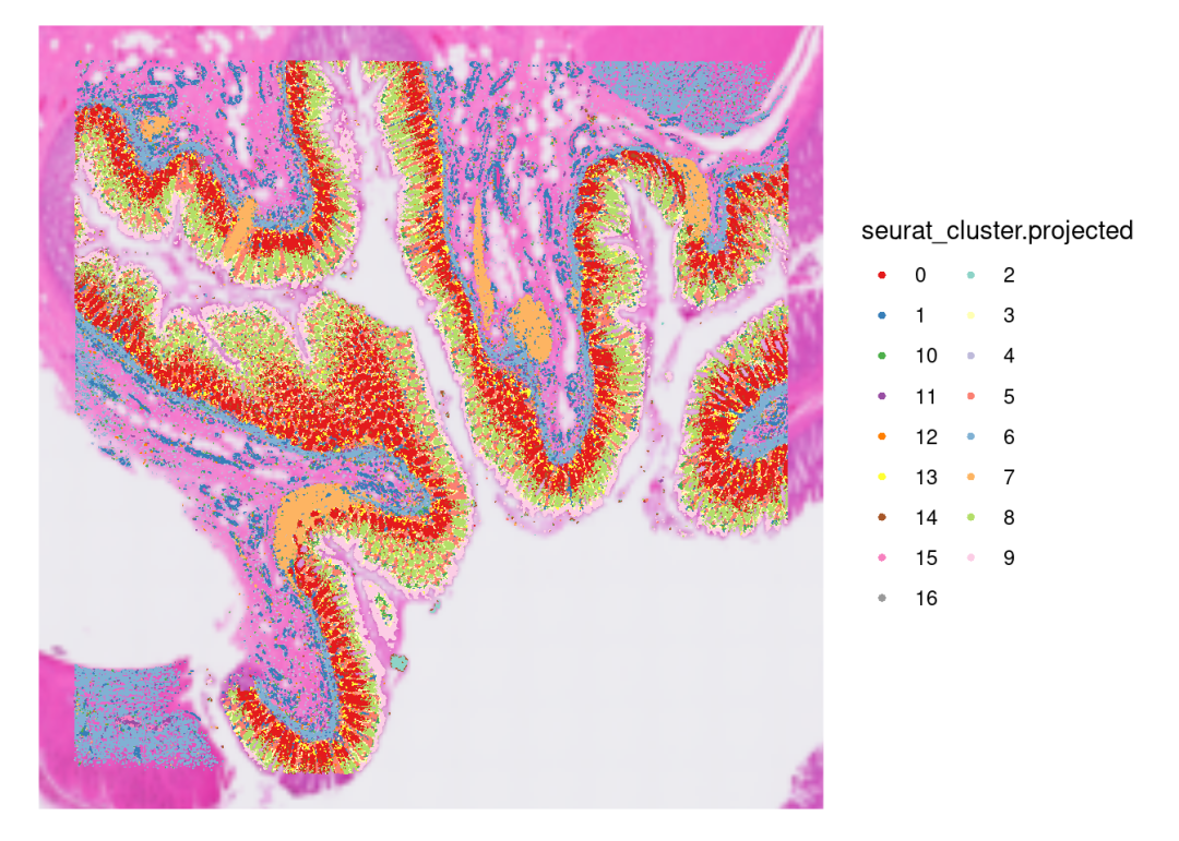 对比原文,其实整个降维后的cluster分布是有一定的特征的。原文描述未见对数据的质控,我们进行了过滤之后,可以看到有部分bins在组织上直接缺失了,所以实际处理中,对于数据的质控还是需要结数据进行设计!