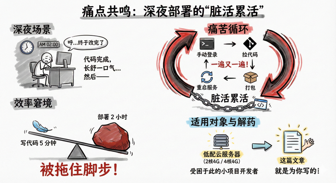 深夜改完最后一行代码,长舒一口气,然后——又要手动登录服务器、拉代码、打包、重启服务…… 一遍又一遍。 明明是个小项目,却总被这些“脏活累活”拖住脚步。