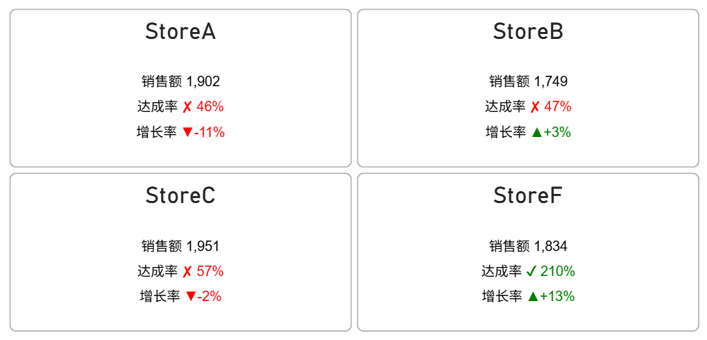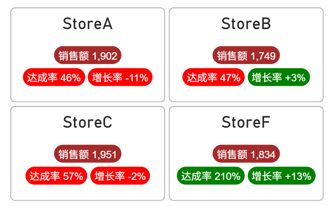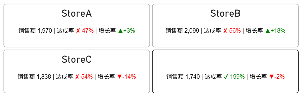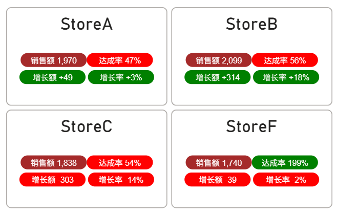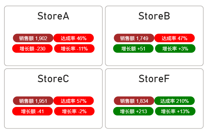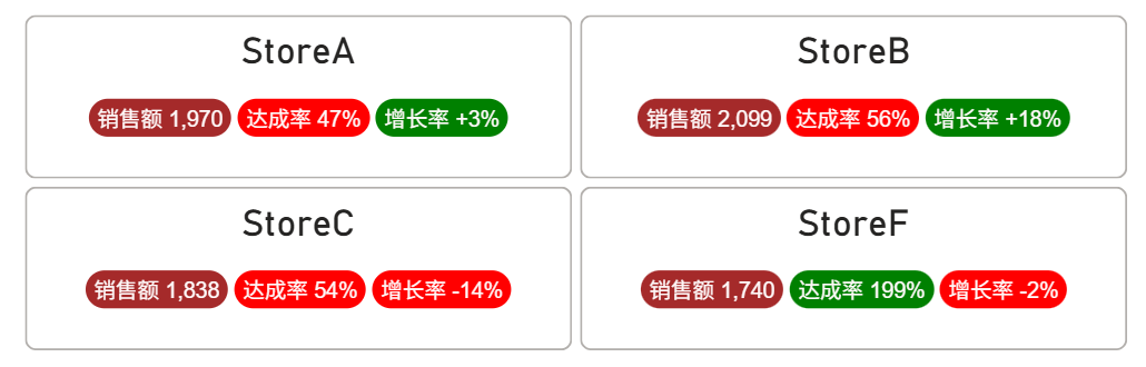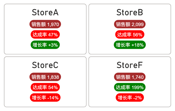 先看效果,以下实现了多个指标横排布局,且带有条件格式图标、颜色: